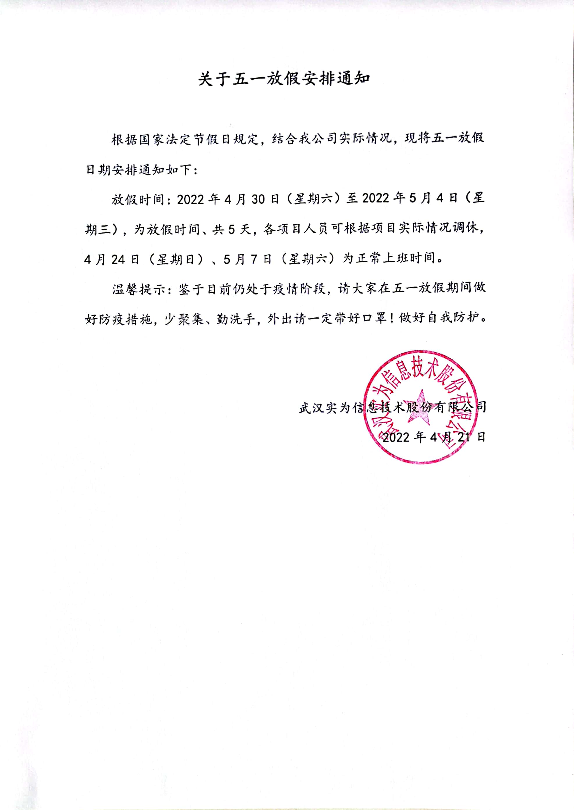 關(guān)于五一放假安排通知